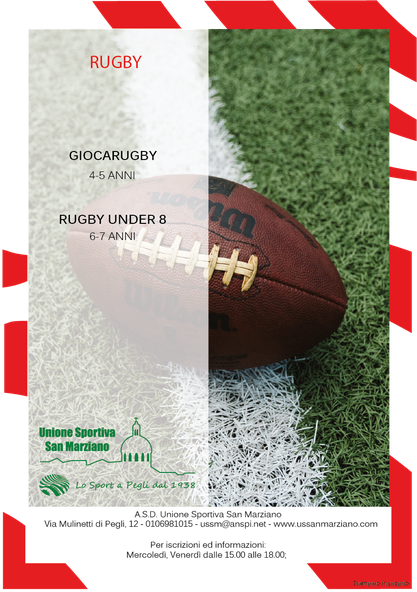 GIOCARUGBY (2021-2020) 4/5 anni LUNEDI’ 16.30 - 17.30 CAMPO USSM RUGBY UNDER 8 (2019-2018) 6/7 anni LUNEDI’ 17.30 - 18.30 CAMPO USSM MERCOLEDI’ 16.30 – 18.00 CAMPO USSM